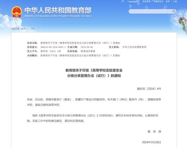 4月22日,記者從教育部獲悉,教育部印發《高等學校實驗室安全分級分類管理辦法(試行)》(以下簡稱《辦法》)。《辦法》指出,高校可以依據本辦法,結合自身實際,制定并實施適用于本校的實驗室安全分級分類管理辦法。